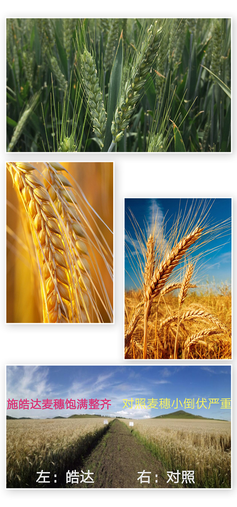 施肥时期:拔节孕穗期 时期问题: 小麦茎秆细,抗倒伏能力和抗病性弱,颖花分化少,孕穗晚,成穗率低,籽粒不饱满; 施肥方案: 叶喷:皓达功能肥1000倍(30-50mL/亩)+皓达硼1000倍(50mL/亩)与杀菌剂一起叶面喷施 滴灌:皓达功能肥100-200mL/亩,随大肥一起滴灌。 施肥效果: 小麦茎秆粗壮,提高抗倒伏能力和抗病性,增加颖花分化数,提高成穗率,提早孕穗,促使小麦籽粒饱满产量高。 |