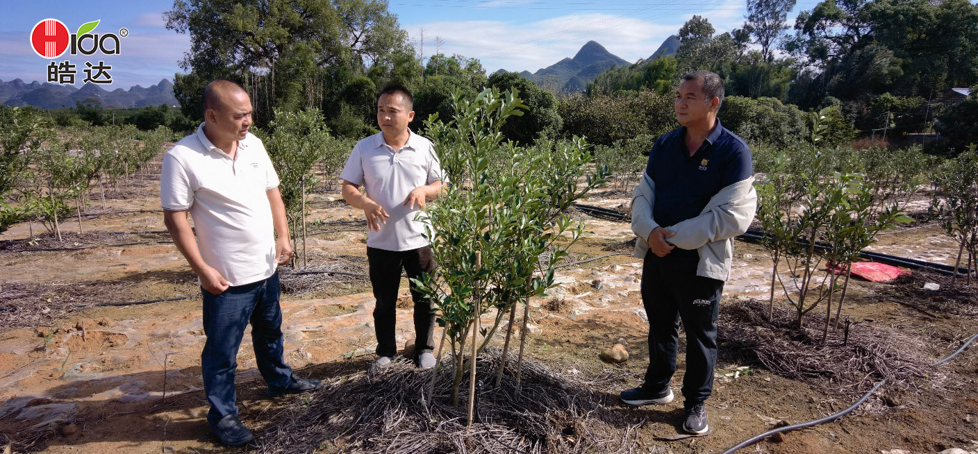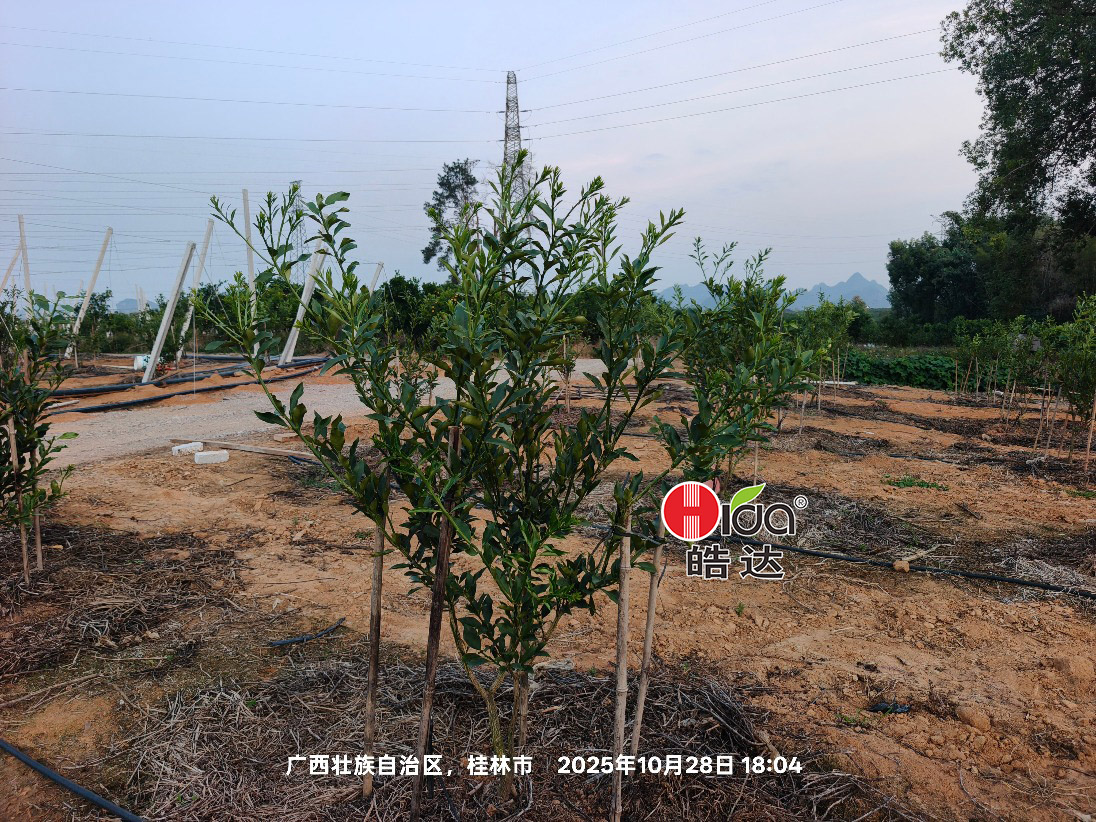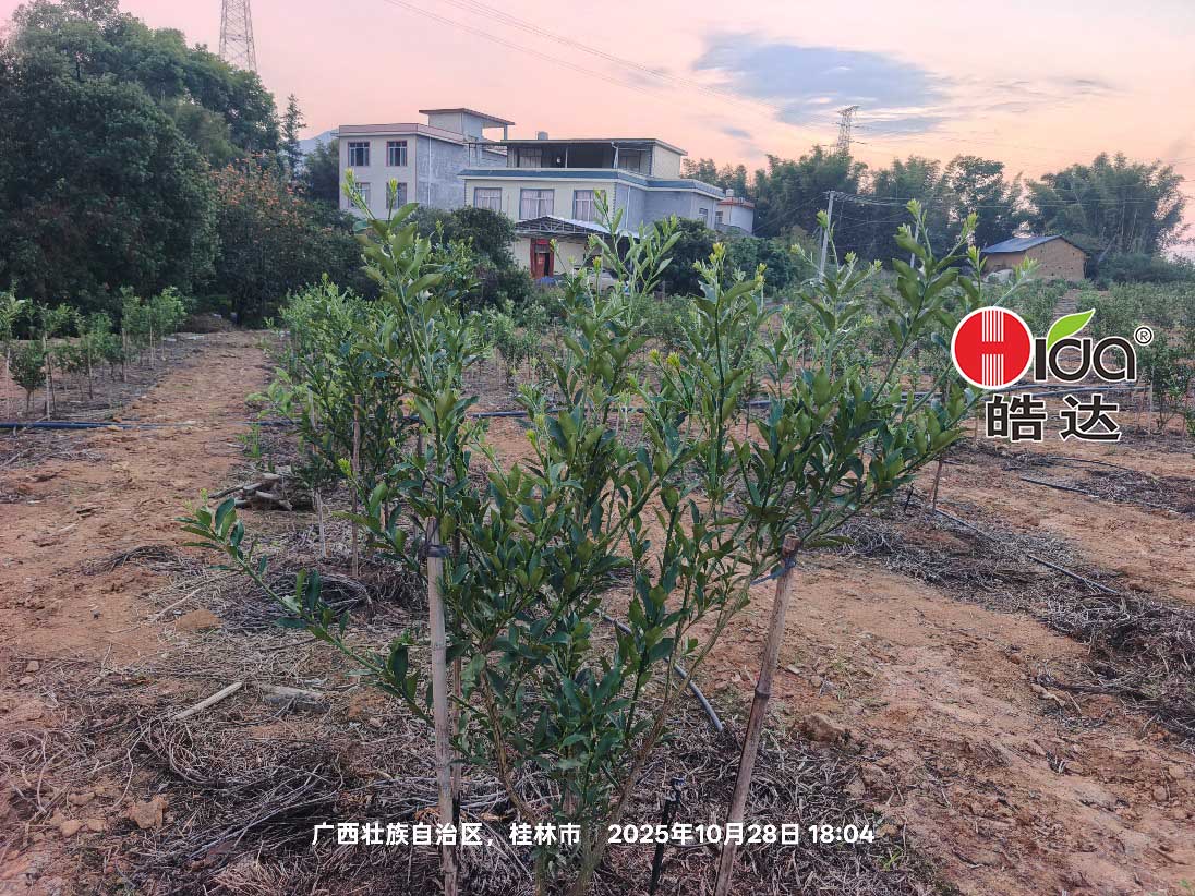2025年10月28日我们来到广西桂林脆蜜金桔果园回访,该园脆蜜金柑是今年4月种植的小苗,全程使用皓达营养方案:皓速补100+皓达增效剂配合皓达菌剂稀释后淋根,每次每株用量皓达20-30毫升,现在棵棵健壮、5次出梢整齐。