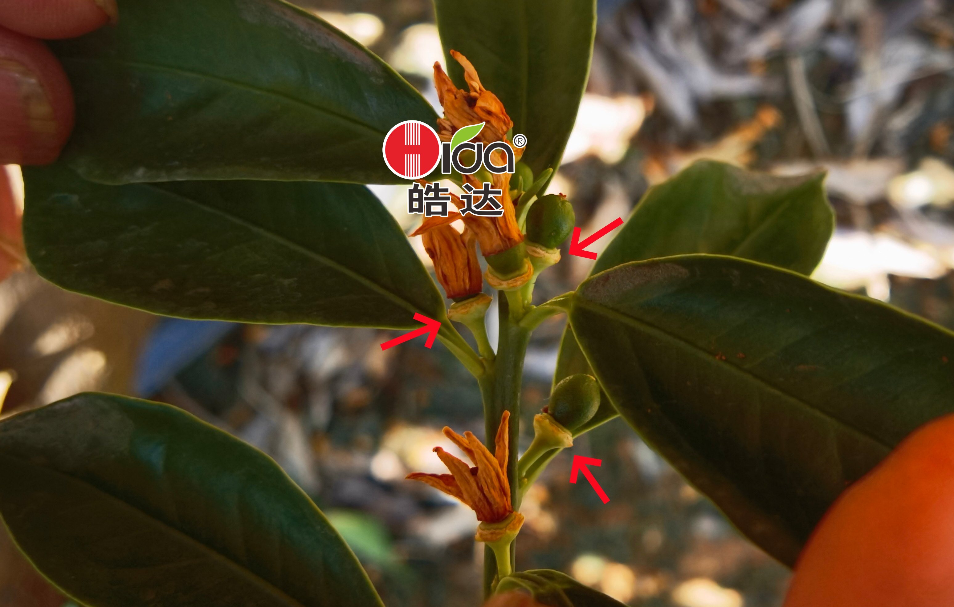 上图红色箭头指处为施用皓达后脆蜜金柑果柄健壮、幼果强势膨大让花瓣与果盘脱离不落果